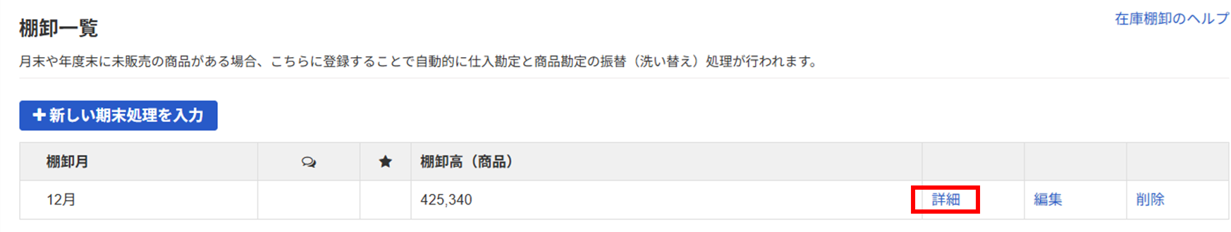 ❸ 処理の結果(仕訳)は、登録された棚卸処理の一覧にある「詳細」から確認します。