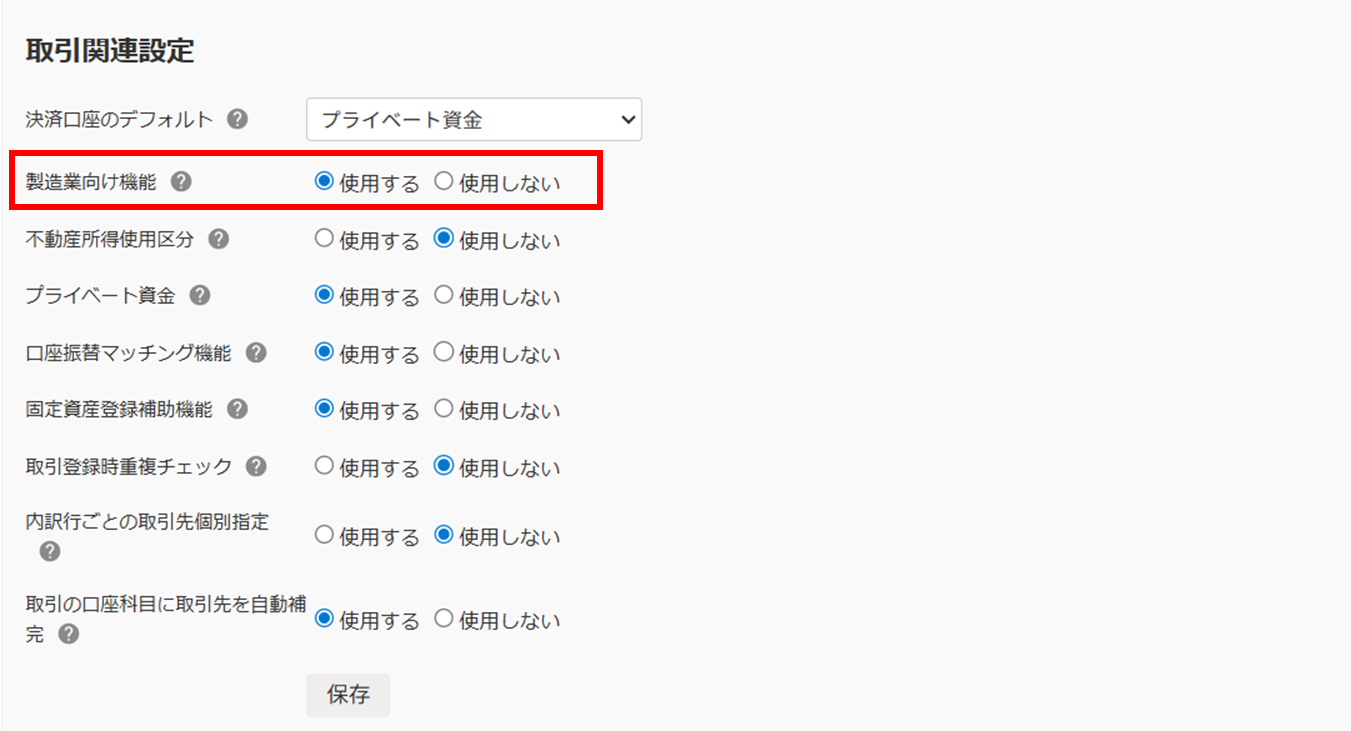 「その他設定」メニュー →[事業所の詳細設定]にて製造業向け機能を「使用する」と設定にしている場合、在庫棚卸を「商品」「製品」「半製品」「仕掛品」「原材料」の各棚卸資産について行うことができます。