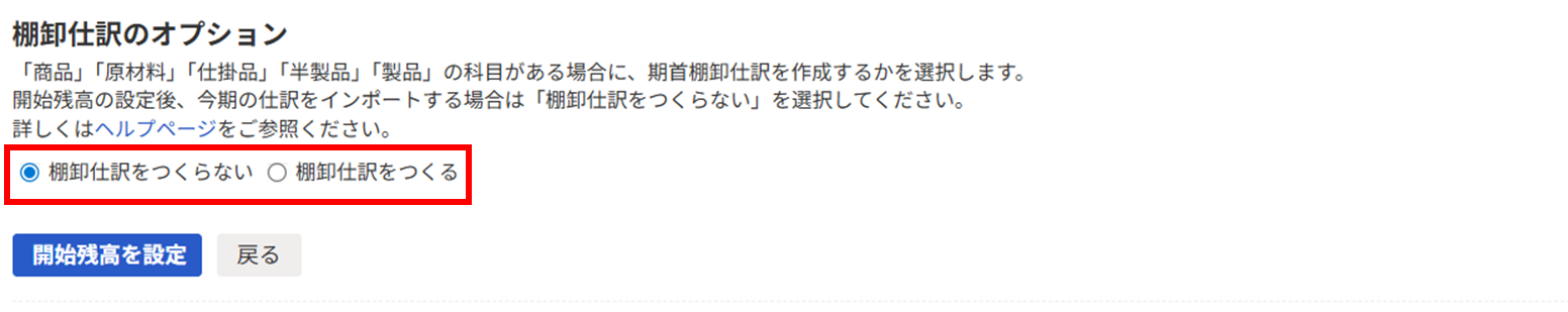 [その他設定]メニュー →[開始残高]にて、棚卸資産の勘定科目に対し残高を入力した場合、期首の振替仕訳を自動で「つくらない/つくる」の選択が可能となります。