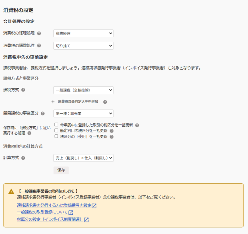 このため、申告書作成を行う前に、以下の消費税の設定をしておきます。