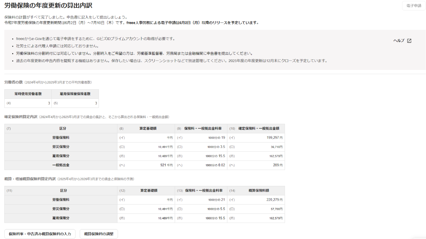freee人事労務で労働保険の年度更新を行うと、簡単に保険料を自動計算でき、計算結果をそのまま転記することで申告書が完成します。