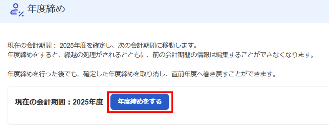 現在の会計年度が、年度締めを行いたい会計年度であるかをご確認ください。