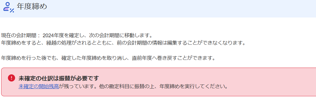 「未確定勘定」が出ている場合は、年度締めを行うことができません。
