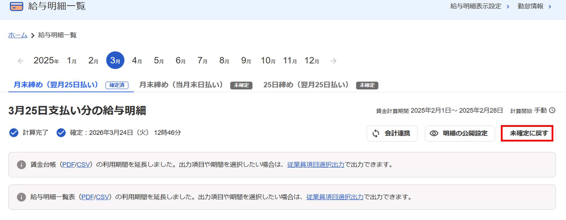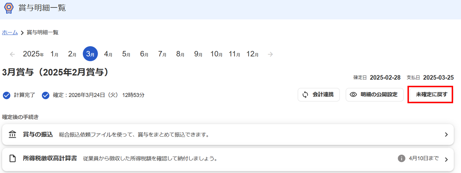 ※ 給与明細(賞与明細)を未確定にすると、締め日支払い日変更前の給与データは削除されます。