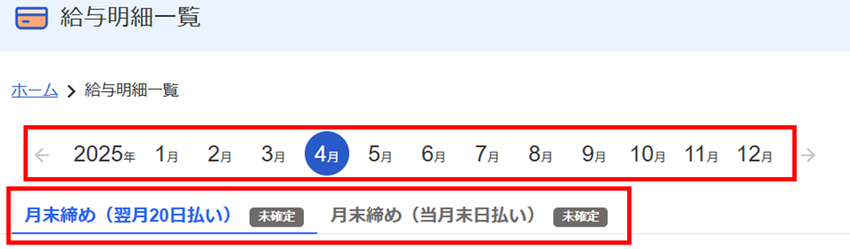 ❸ [給与]メニューまたは[賞与]メニュー → 給与を支給する該当月を選択し、正しい締め日支払い日で給与計算されているか確認します。
